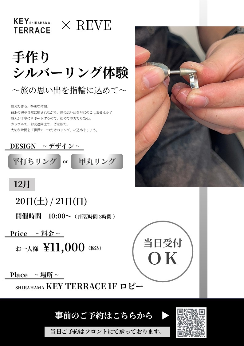 KEY TERRACEとREVE(レーヴ)は、共同企画による手作りシルバーリング体験イベント「旅の思い出を指輪に込めて」を12月も開催いたします!