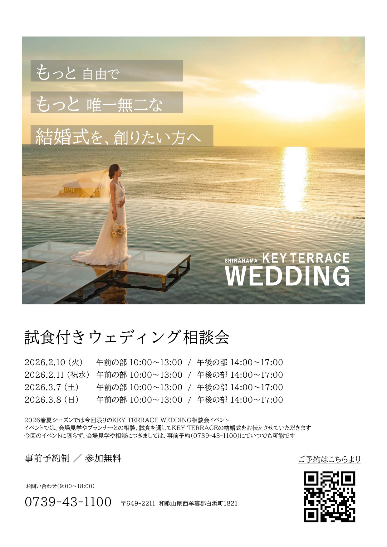 SHIRAHAMA KEY TERRACEでは、下記の日程にて試食付きウエディング相談会を開催いたします。